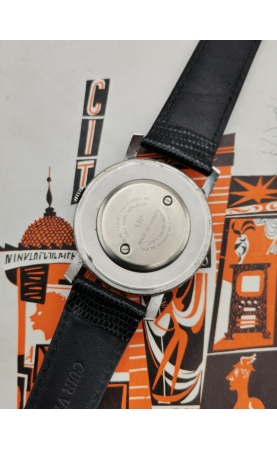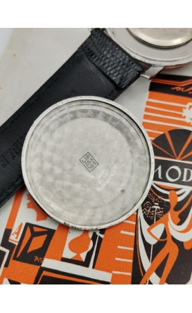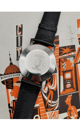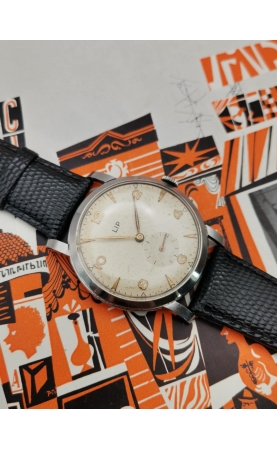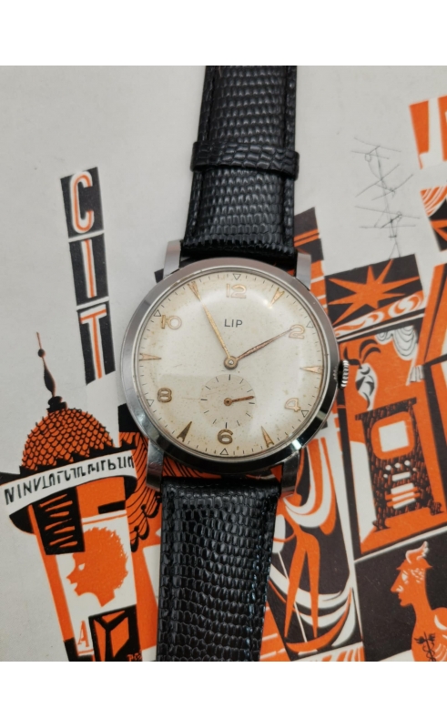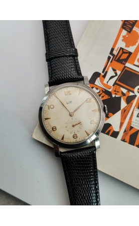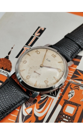 Après la seconde guerre mondiale, Fred Lip hissera LiP et sa production en fleuron français. La production LiP est très hétéroclite, passant du gousset au réveil, par des montres de plongées ou des chronographes. L’exemple présenté ici est une production des années 50. C’est une référence peu courante avec un boitier jumbo (grand diamètre) aux cornes stylisées. C'est une rare version avec un cadran atypique avec ses index et chiffres arabes dorés. La montre est complètement originale et en superbe condition. Une vraie pièce historique, d'une grande qualité de fabrication représentative de la période LiP des années 50.