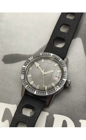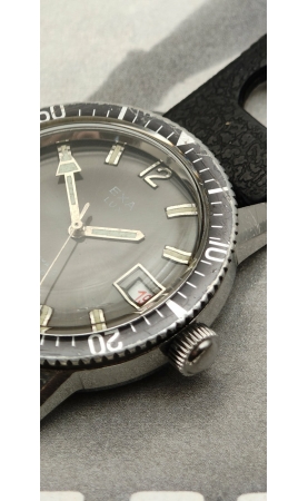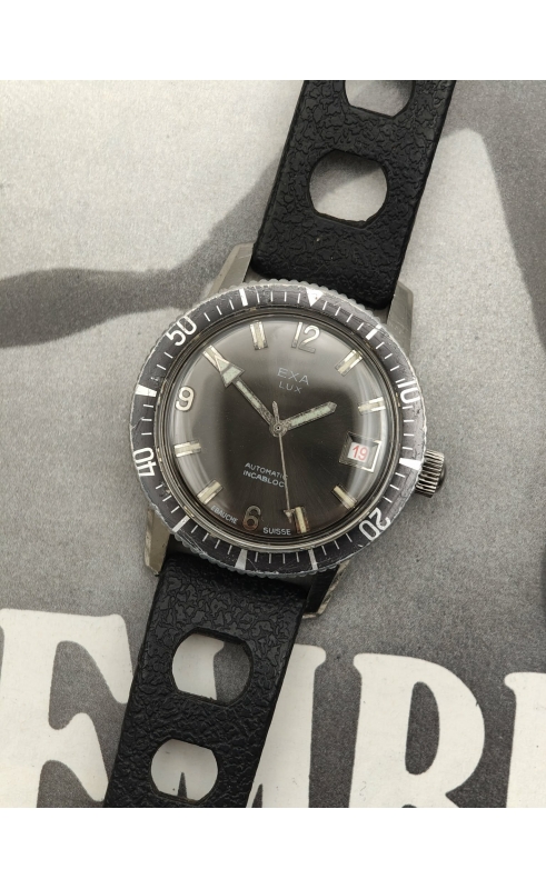 En 1967, Exa est une marque déposée à Bordeaux. Un joli boîtier skindiver acier avec un cadran ardoise typique des modèles de plongée comme Airain ou Dodane. Lunette d'origine bidirectionnelle. Mouvement ETA avec date roulette (noir / rouge) made in swiss. Véritable classique de l'époque des seventies et de la montre pour la plongée de loisir. L'étanchéité aujourd'hui est en revanche non garantie.
