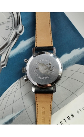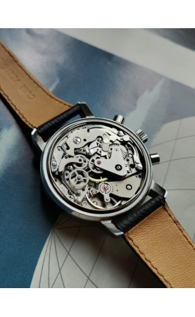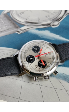 Airain est une marque de la maison Dodane créée en 1934. Ce chronographe est une véritable capsule temporelle : c'est une montre NOS - neuve de stock. Rare chronographe panda en acier inoxydable, équipé d'un Valjoux 7736 3 comtpeurs. La montre possède encore le reste d'un stickers au dos. Pièce rare.