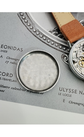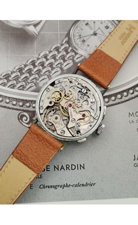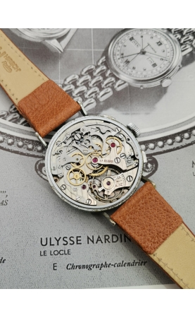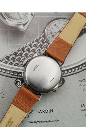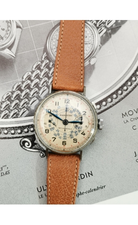 Augustus est une marque suisse disparue, avec très peu d'informations. Cette montre-bracelet est un large chronographe à double échelle (télémètre et tachymètre) des années 1930s. L'état est superbe, avec un cadran sans défaut signé Fab.Suisse à 6h. Boitier acier, anses fixes, poussoirs carrés. Le mouvement est un rare Landeron 39 roue à colonne avec une haute finition (high grade).