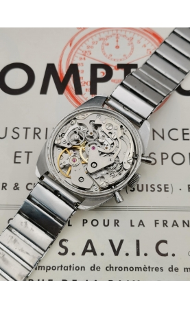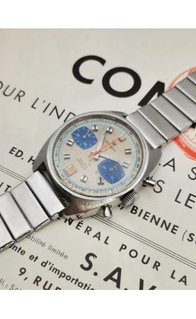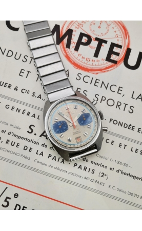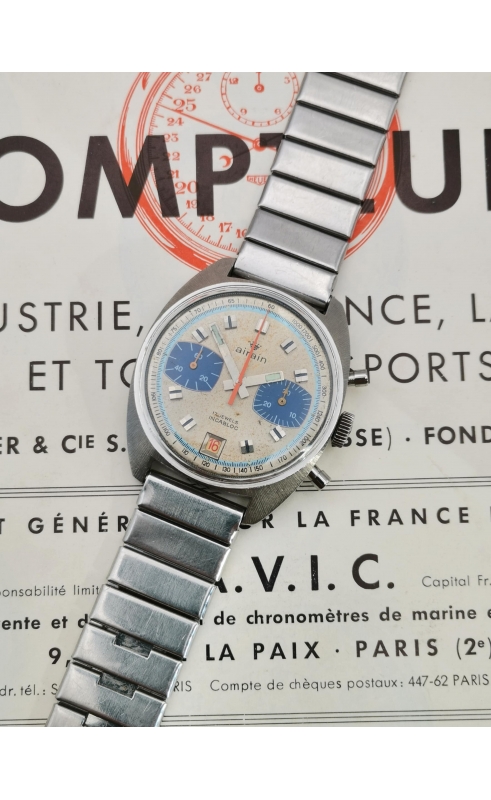 Airain est une marque de la maison Dodane créée en 1934. Ce chronographe sport en acier est équipé d'un Valjoux 7734 2 compteurs avec dato. La montre possède une rare configuration dite "exotic" avec sous compteurs bleu et piste tachymètrique bleu ciel. Pièce très rare à la vente.