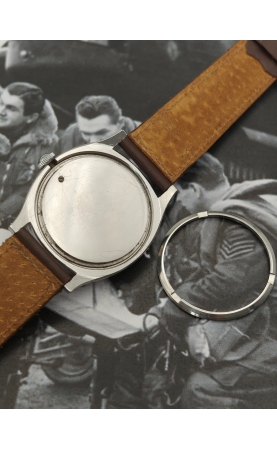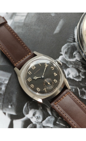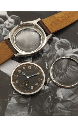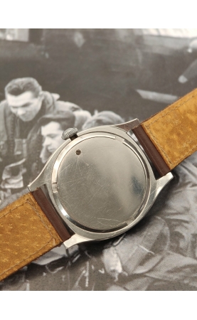 Granges, 1856, naissance de la manufacture Eterna. Au début, seulement des calibres pour gousset y sont fabriqués. Début des montre-bracelets, avec dès 1908 un réveil matin. Plusieurs innovations avec la filiale d'ébauches ETA, avec des mouvements automatiques précoces. Dans les années 30, Eterna produit des montres spécialement pour les pilotes d'aviation : large boitier "étanche et anti-poussière", cadran noir lumineux au radium, larges aiguilles type cathédrale. On retrouvera ce modèle dans l'armée tchécoslovaque, où l'on retrouve une gravure "Majetek Vojenské Spravy" (propriété de l'autorité militaire). Notre exemplaire est une version précoce équipé d'un calibre Eterna 520, un boitier "tortue" étanche de 36 mm, et un cadran chiffres arabes et petite seconde à 6h. Le fonde de boîte possède sa vis d'origine pour accéder à la vis de tirette pour démonter mouvement et cadran. Cet exemplaire est une version civile dépourvue de toutes gravures militaires. Pièce historique, très rare et en parfait état.