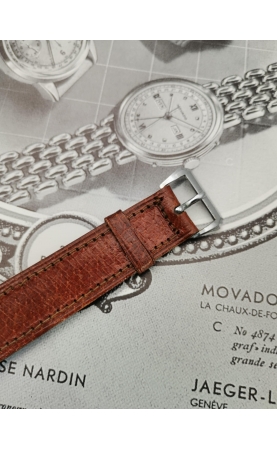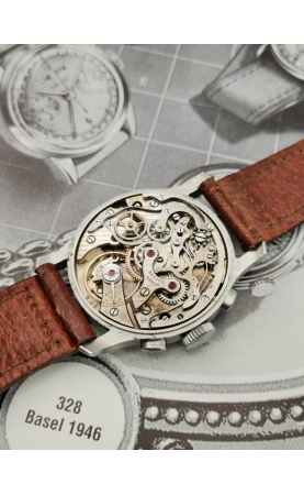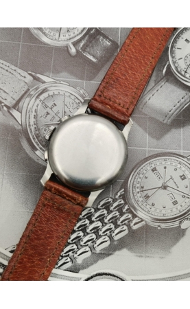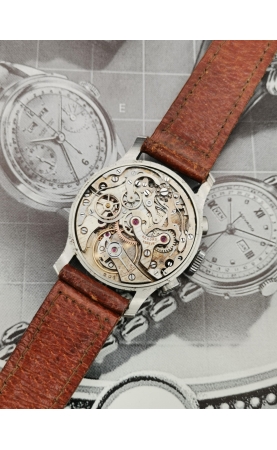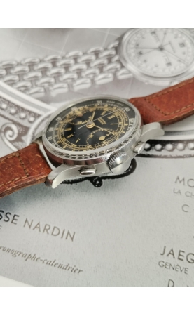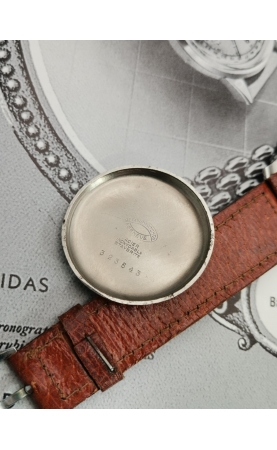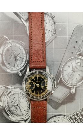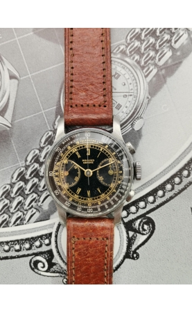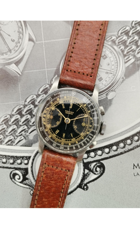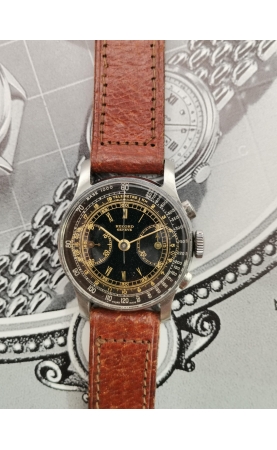 Record est née en 1903 à Tramelan. Elle prend le nom de Record Watch Co en 1933 en s'installant à Genève. Record lance de nombreux modèles, notamment des montres étanches, et des chronographes pour les sports et ingénieurs. Notre exemplaire est un magnifique et rare chronographe acier de la fin des années 30, avec un cadran noir gilt. La montre est dans un parfait état, avec un boitier staybrite non poli, poussoir olives d'origines, couronne originale. Le mouvement est de haute volée, avec un rare Valjoux VZ utilisé notamment par Patek Philippe et Audemars Piguet. Une pièce d'exception dans un état extraordinaire !