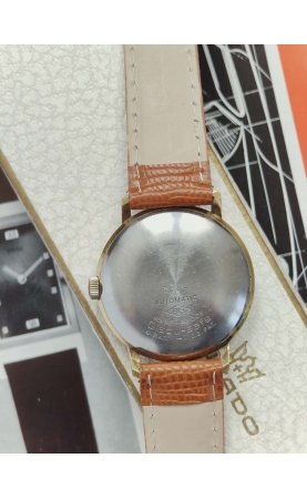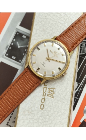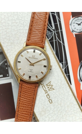 Ducado H+H est une marque allemande fondée par Hermes et Hermes à Pforzheim. Notre exemplaire est un modèle de 1966-67, equipé d'un boîtier RP. RP pour Richard Pfisterer, est une fabrique de boîte allemande pour l'horlogerie, des boîtiers étanches et de plongée. Le boitier est signé discu-safe, 100% waterproof, et resistant à des températures extrèmes -20 +15° F°. La montre est livrée avec son écrin d'origine.