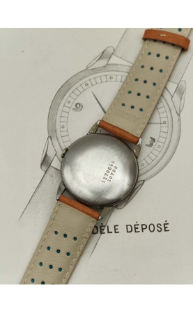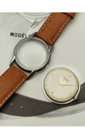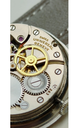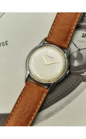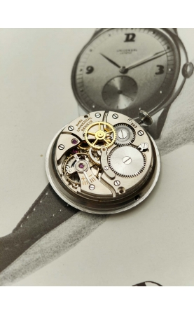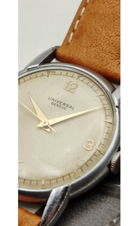 Descombes & Perret fondent “Universal Watch” en 1894 au Locle. Universal veut proposer une gamme de chronomètres et chronographes de fabrication suisse. Après la première guerre mondiale, Universal s’installe à Genève pour l’ouverture des marchés étrangers. Après avoir été en 1937 rebaptisé Universal Genève, la manufacture se concentre sur les modèles chronographes mais aussi des time only au design audacieux. Notre modèle date de 1946, c'est rare version, avec un design incroyable dit "evil lugs" ! Le cadran crème est signé Universal Genève, et possède un boitier snapback. Le cadran est original, avec les index 12 3 6 9 appliqués.