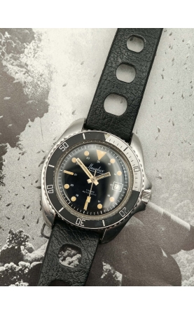 Heurlux est une marque suisse de la Chaux-de-Fonds qui produit des montres depuis les années 50. Cette Heurlux est une montre professionel de plongée. Modèle très intéressant du début des années 80, version automatique, avec un boîtier 20 atmosphères en acier à fond vissé. Notre modèle possède un superbe boitier 844 MRP s.a fabriqué en Suisse. La montre est entièrement d’origine, avec son aiguille type “magnum" et son imposante aiguille des secondes pelle. C’est le même boitier et mouvement que la fameuse Heuer 844 Monnin. L'état est vraiment exceptionnel !