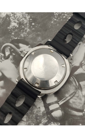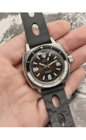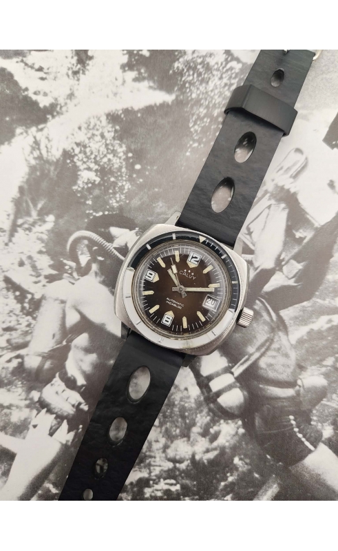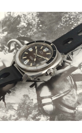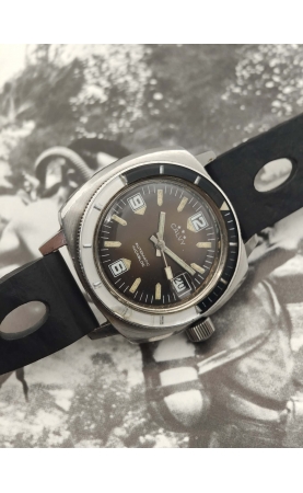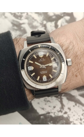Calvy est une marque horlogère française du groupe Dodane. Cette plongeuse 300 m reprend les codes des 1000 m de Sandoz ou Nivada, avec un large boitier coussin et une lunette bakélite bleue. Rare version avec un cadran tropical. Ces versions sont appelées "baby panerai" pour leurs ressemblances avec les boitiers de la marque Panerai.