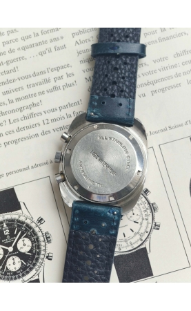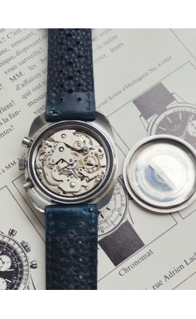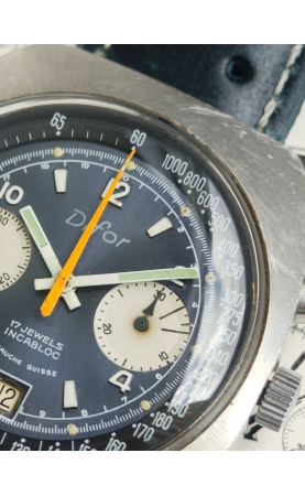 Difor Suisse(DIFusion HORlogère est une société spécialisée dans la vente à distance sur catalogue originaire de Besançon . Elle est très active au cours des années 60 et vend des milliers de montres de qualités inégales. Elle emboîte ou même juste dépose parfois seulement son nom sur les cadrans. Notre exemplaire est un chronographe des la fin des années 60 voir début 70, avec large boitier tonneau et un rare cadran bleu et une aiguille orange, rappelant le design des Heuer Carrera 73453 bleues.