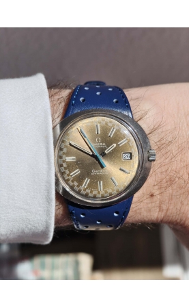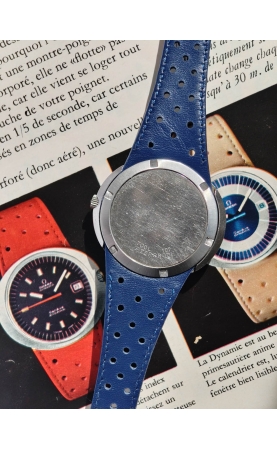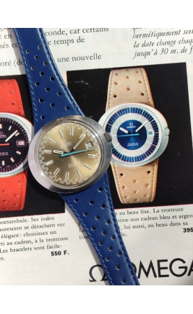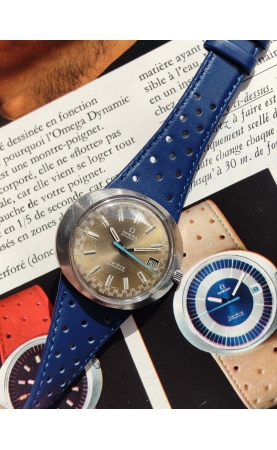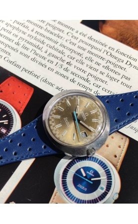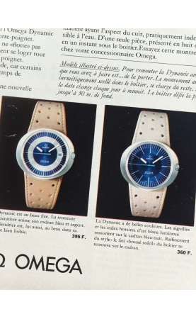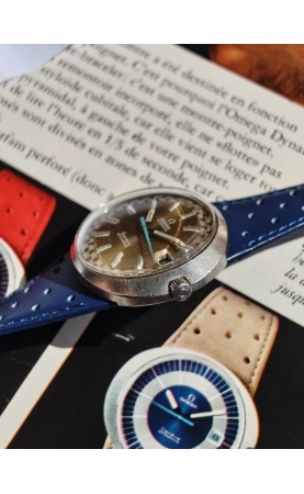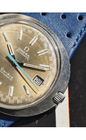 En 1968, année de naissance de la gamme Genève Dynamic de la manufacture Omega, est un modèle à sa sortie, qui devait être une montre révolutionnaire. La montre Dynamic a été dessinée en fonction de l'anatomie du poignet. De forme ovale, remontoir incorporé, elle ne "flotte pas" comme disait la publicité d'époque. Notre exemplaire est la plus désirable : version automatique sans avec, une des versions la plus recherché. Notre exemplaire est une rare version de la première série avec cadran type damier. Le boîtier conserve encore son fini brossé soleil d'origine. Le cadran est dit tropical, un cadran bleu marine qui a complètement marron bronze.